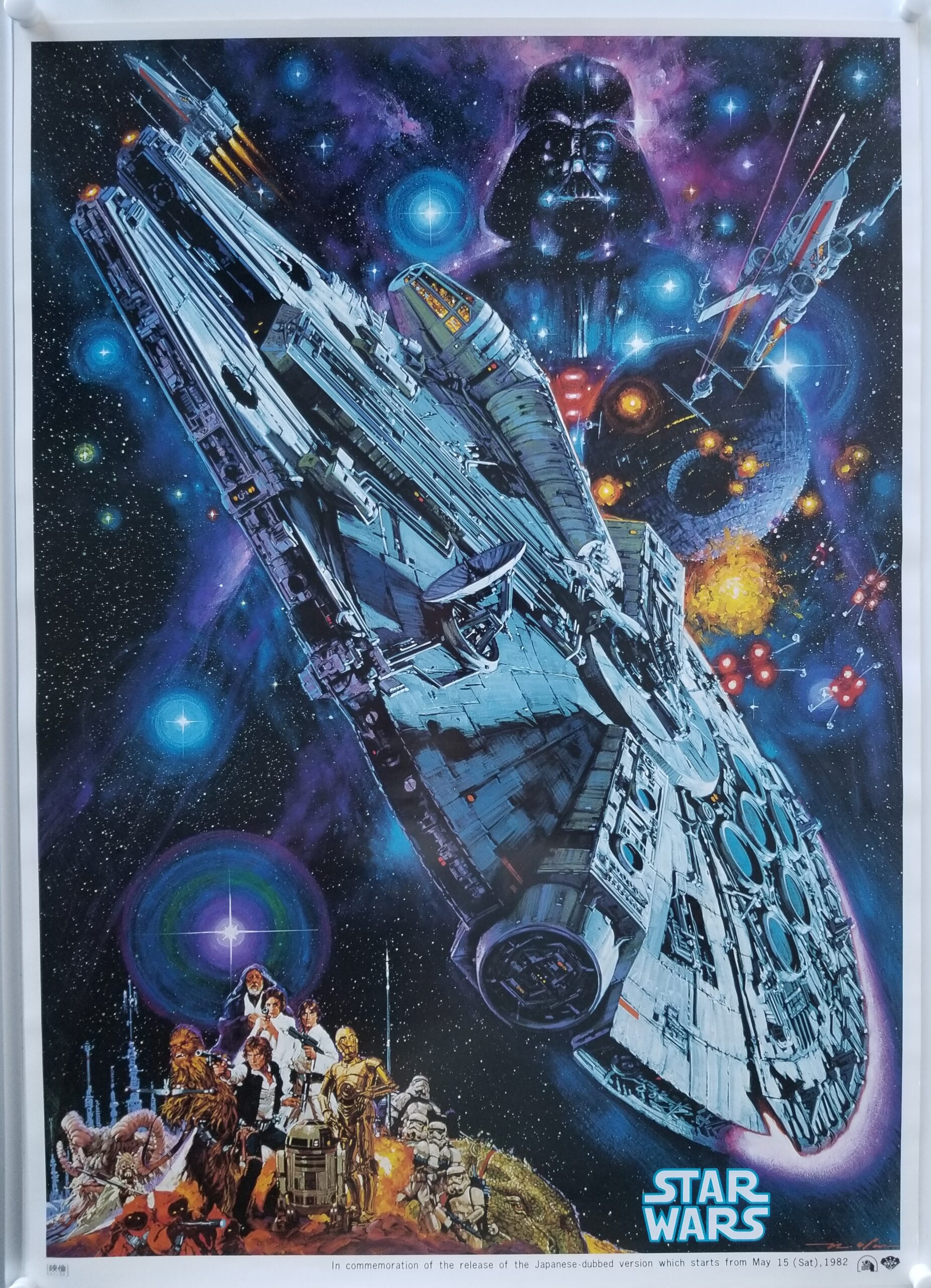 This is an original Japanese poster for a 1982 release of Star Wars. 1982 was the year the film was dubbed in Japanese for the first time and this poster was printed to commemorate the release.? The Millennium Falcon takes centre stage in this poster by Japanese illustrator Noriyoshi Ohrai.