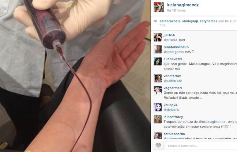 A apresentadora de TV Luciana Gimenez passou por procedimento com o próprio sangue em Nova York e postou na rede social Instagram. A repercussão das postagens não foi positiva