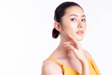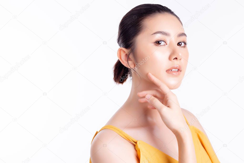 Retrato encantador beleza jovem mulher asiática. Menina bonita atraente tem boa pele rosto, corpo. Senhora glamour aplicar maquiagem natural em seu belo rosto. Bonita fêmea mostrando sua bela pele de rosto — stock imagem, fotos sem royalties