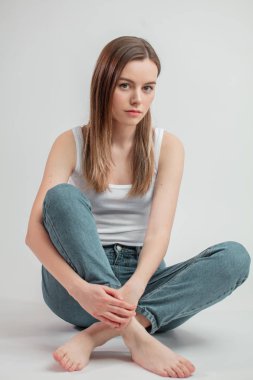 Jovem mulher bonita sentada no chão com pernas cruzadas