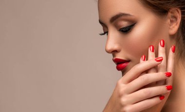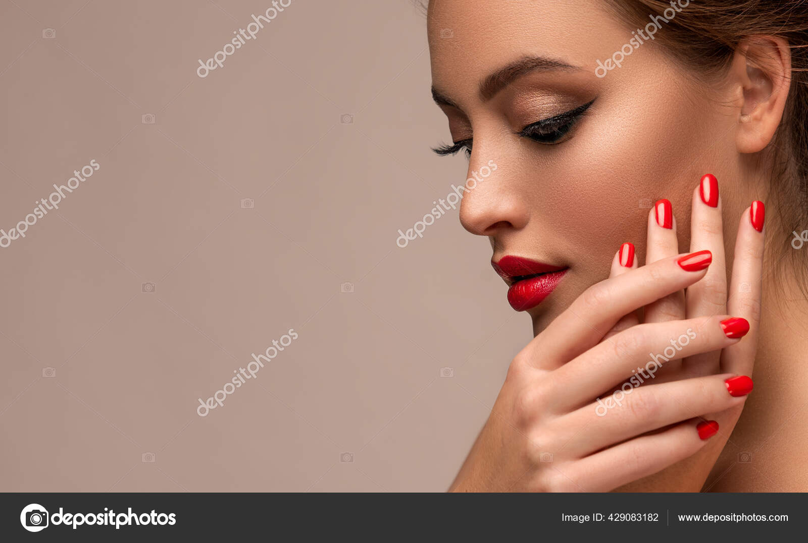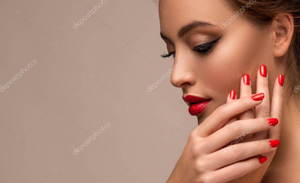 Mulher bonita mostrando lábios vermelhos e unhas de manicure. Menina modelo de olhos azuis. Boa noite maquiagem brilhante. Beleza, maquilhagem e cosmética — stock imagem, fotos sem royalties