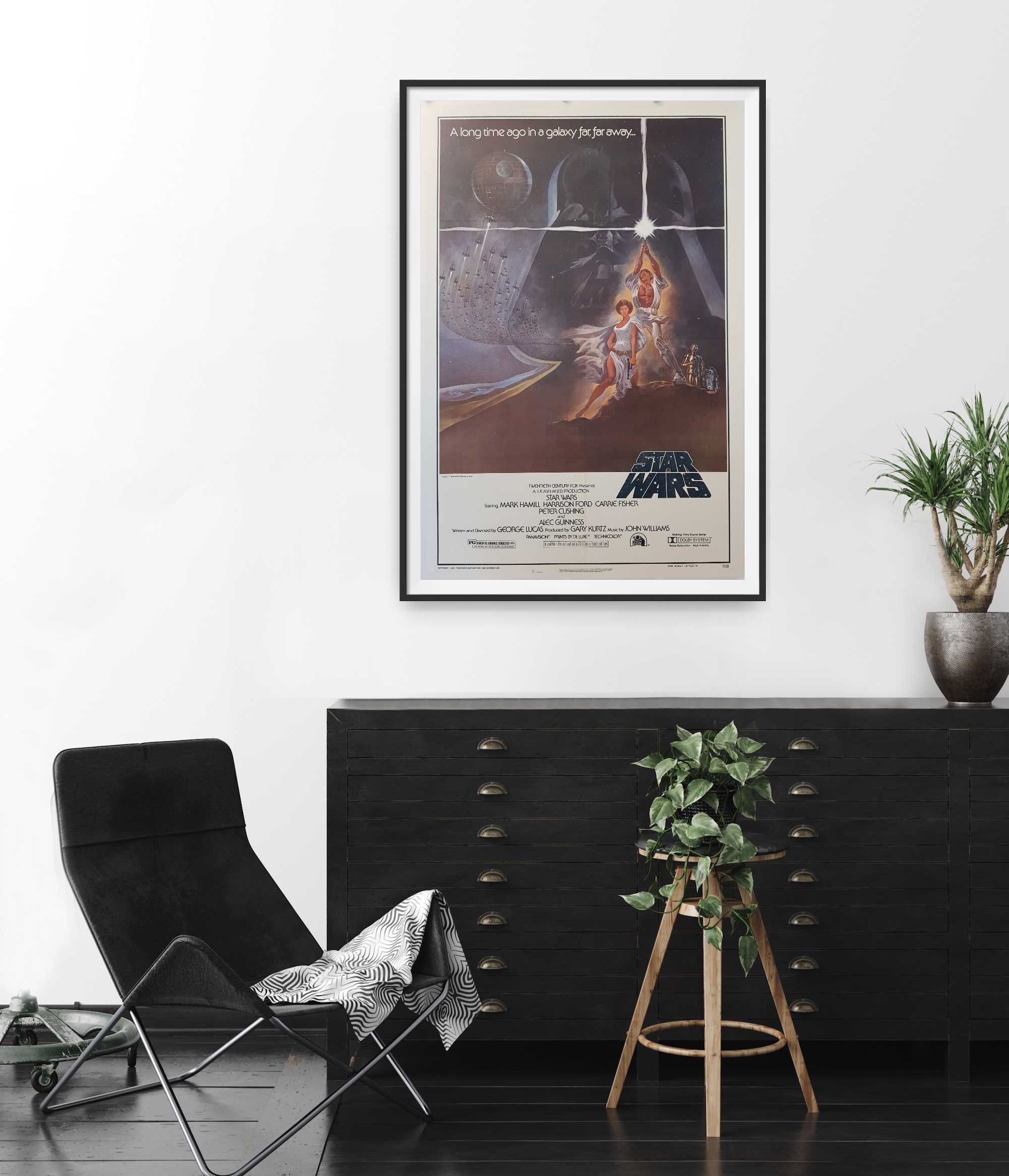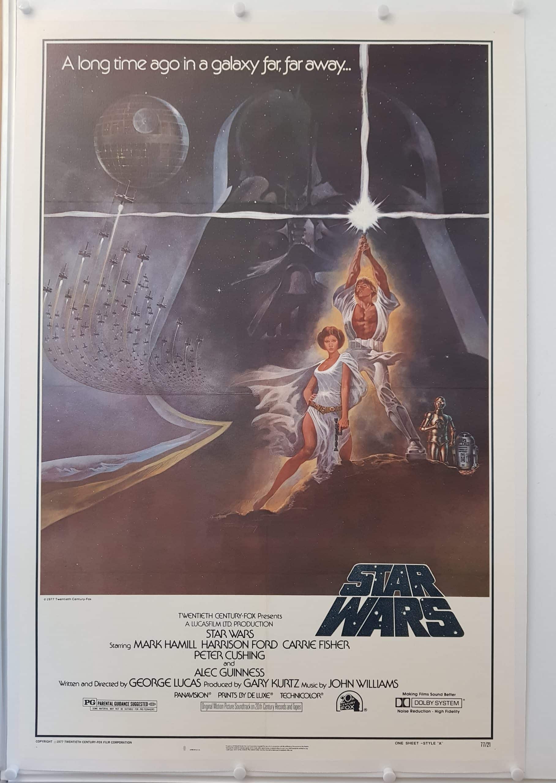 Star Wars was so popular in US Cinemas that four distinct prints runs of this poster were created for the first release of the film. This is from the 2nd print run which can be distinguished by the NSS number of “77/21” which unlike the 3rd and 4th printing doesn’t have “Star Wars” written under it.
