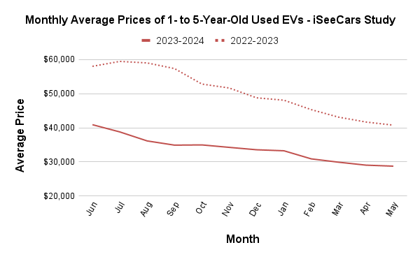 | Year-over-Year Change in 1- to 5-Year-Old Used EV Prices - iSeeCars Study | |||