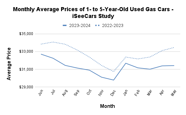 iSeeCars analyzed over 2.2 million 1- to 5-year-old used cars sold in May 2023 and 2024. The average listing prices of each car model were compared between the two time periods, and the differences were expressed as both a percentage difference from the 2023 price as well as a dollar difference. Heavy-duty vehicles, low-volume vehicles, vehicles discontinued as of the 2023 model year, and vehicles in production for fewer than four of the last five model years for each period were excluded from further analysis.
