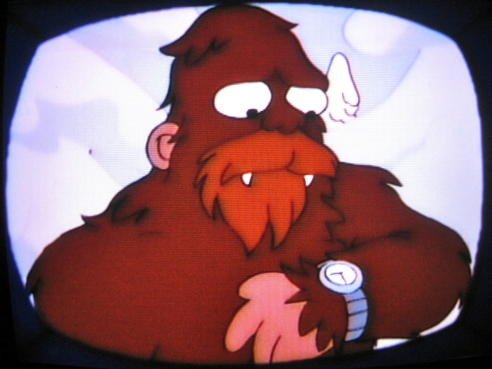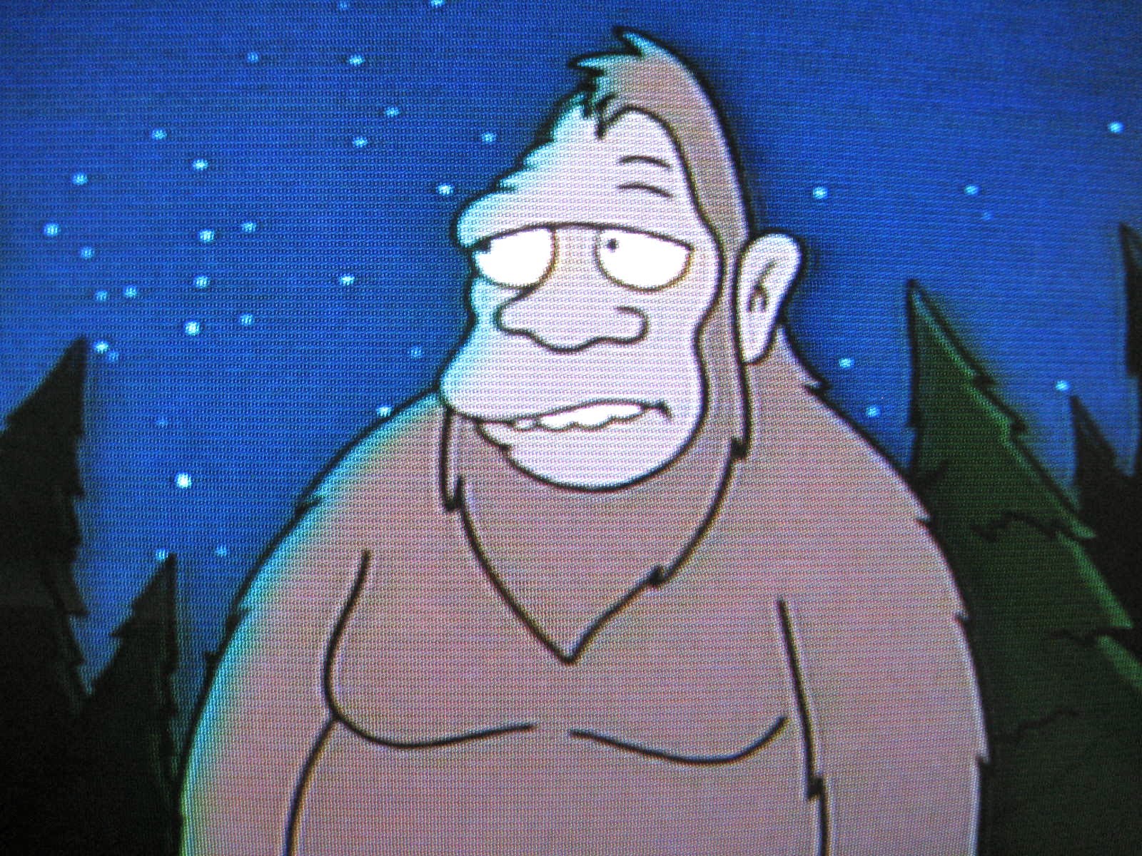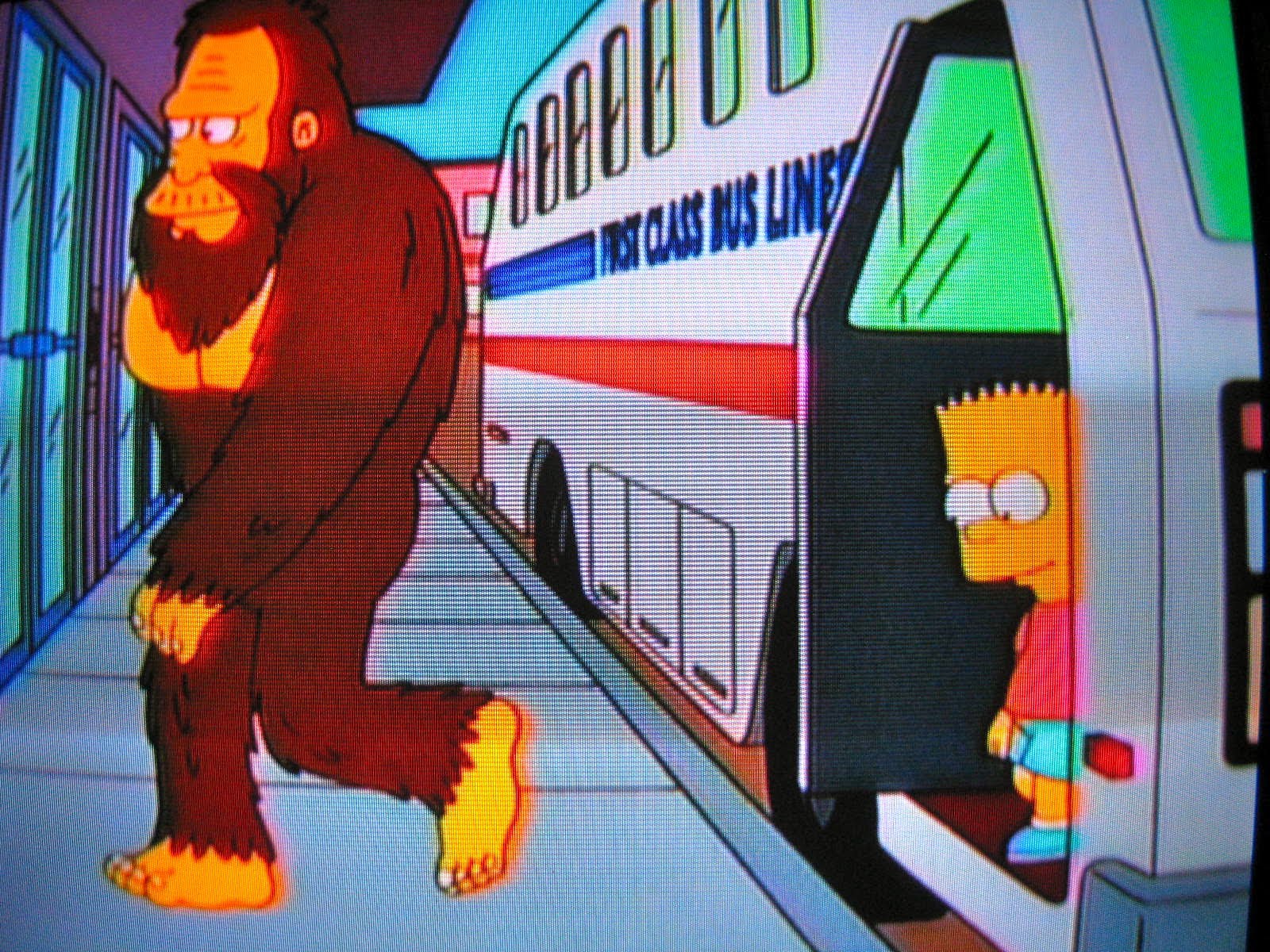 Spanish Fry (July 13, 2003).This is actually from an episode of Futurama, but since that series also came from the mind of Simpsons creator Matt Groening, close enough. Anyway, the Futurama gang camps out in Duraflame National Forest. It's a National Bigfoot Preserve, where the park ranger shows them a film short, "Bigfoot: Endangered Mystery." True believer Fry, who calls Bigfoot his hero, is saved by the creature at the end of the episode, just as a space monster is about to chop off Fry's "lower horn." Note that Futurama's Bigfoot closely resembles The Simpsons' Barney. Can't find a proper clip, but take a look at this.