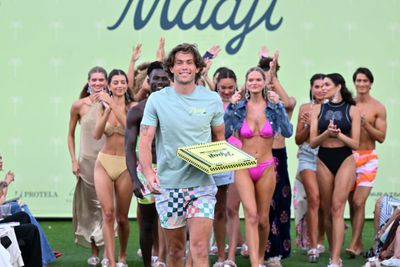Another model got a bit peckish, taking a pizza box down the runway with him at the The Maaji Resort Stories Premiere.