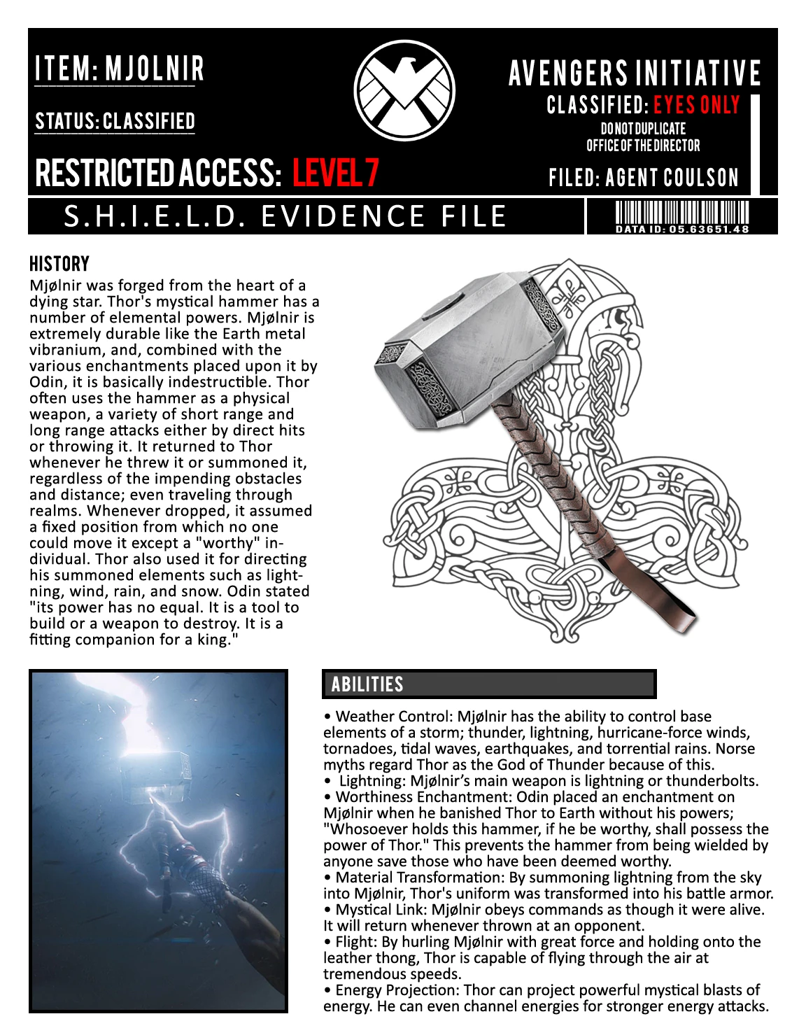 Standard Equipment: Various firearms, Vibranium Shield, Mjölnir, Stormbreaker (temporarily)