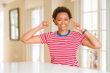 Jovem mulher afro-americana bonita em casa Sorrindo apontando para a cabeça com as duas mãos dedo, ótima ideia ou pensamento, boa memória — stock imagem, fotos sem royalties
