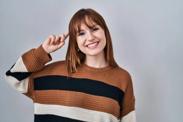 Jovem mulher bonita vestindo camisola listrada sobre fundo isolado sorrindo apontando para a cabeça com um dedo, ótima ideia ou pensamento, boa memória — stock imagem, fotos sem royalties