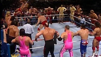 Speaking of favorites, this entry is my favorite Survivor Series elimination match, which happens to be from my favorite Survivor Series PPV. The late 80s tag division in the WWF was the stuff of legend, and this match assembled all nine of the company's regular teams (plus The Conquistadors) for an epic 40-minute war. WWF newcomers The Powers of Pain captained an absolutely stacked team of the Hart Foundation, British Bulldogs, Rockers, and Young Stallions, against Demolition's squad of Anderson & Blanchard, The Rougeaus, The Bolsheviks, and the aforementioned masked jobbers. The action in this match was non-stop for almost the entire duration, until late in the bout Demolition's manager Mr. Fuji turned on them and helped the Powers of Pain take the match. This was in my experience the first-ever double-turn, and it broke my 13-year-old brain.