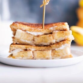 Home > Lunch > Sandwiches > Honey and Banana Sandwich Honey and Banana Sandwich October 5, 2020 | 2 Comments SAVE TO RECIPE BOX Jump to Recipe This post may contain affiliate links. Please read my disclosure policy. This Honey and Banana Grilled Cheese Sandwich is the BEST — honestly good enough to pass as a dessert! It all starts with rich buttered brioche bread that is covered in creamy mascarpone cheese with thick banana slices, a drizzle of honey, and a sprinkle of cinnamon. The bread and bananas get caramelized as they’re grilled, which results in an explosion of flavor and the perfect sweetness. Check out more easy grilled cheese recipes: Grilled Cheese Margherita Sandwiches or these French Dip Grilled Cheese Sandwiches. Sweet grilled cheese sandwich To add a little geography and culture to your day, I’m bringing you a grilled cheese sandwich that represents Utah — where I’m from and where I currently live. In Utah (the Beehive State, by the way), we’re known for our honey, so I wanted to incorporate honey into the sandwich. And in my opinion, nothing pairs better with honey than bananas and cinnamon. And then there is always a need for cheese in a grilled cheese sandwich. Mascarpone cheese makes this sandwich unbelievably creamy and sweet. If you’ve never tried mascarpone– fair, warning–you might be hooked. I’d describe it as a sweet (less tangy) cream cheese. The flavor of mascarpone is milder and texture creamier than cream cheese thanks to the heavy cream in the mixture. This grilled Honey Banana Sandwich is a bit unique, but you have to give it a try; you’re going to love it! Brioche Bread The bananas, honey, cinnamon, and mascarpone cheese are sandwiched in between two unforgettable pieces of brioche bread. Brioche is my favorite to use for sandwiches, and it’s even better when it’s grilled for a grilled cheese sandwich. The brioche bread makes the sandwiches mouth-wateringly delicious. Brioche has a rich flavor, soft texture, and offers big thick slices (a must for a good grilled cheese). The bread is made with real butter, sea salt, and a touch of milk. QUICK TIP How is brioche different from regular bread? Brioche bread contains more butter and eggs than regular bread. This increases the fat content, which gives brioche bread its light, flaky, pastry-like qualities as compared to regular bread. The eggs give it a slightly golden color, which adds to its specialness! How to make a sweet grilled cheese sandwich Start by adding a thick layer of mascarpone cheese to one piece of bread. Mascarpone cheese can be pricey, but we don’t use that much in these sandwiches, so it’ll last you for quite a few. The mascarpone cheese is a highlight in these sandwiches so don’t skip it! Add thick slices of a ripe banana to the other slice of bread. Because the bread is so thick, you don’t want the filling to get lost; cut the bananas into 1/2-inch to 3/4-inch thickness. Get a banana with golden yellow (not brown, not green) skin. Drizzle on the honey. Be as generous or as scarce here as you’d like. We like about a tablespoon of honey, but it does make for a pretty sweet sandwich. If you prefer less, cut back on the honey or replace it with peanut butter or almond butter. Add a sprinkle of cinnamon. This spice is optional but adds another dimension of flavor. You could spice this sandwich up even more with an extra sprinkle of nutmeg. For a fun fall/winter twist, add a sprinkle of pumpkin pie spice or apple pie spice! Place the pieces of bread with the fillings together; add a good amount of butter to the outsides of the bread (where it will hit the skillet). I recommend using REAL butter in a tub for easy application and smooth spreading onto the sandwich. Add the grilled cheese to a large skillet or, even better, a griddle. Grill for 2-3 minutes, on medium-high heat, or until browned to your liking on each side. The timing will vary depending on the pan/griddle you use, the actual heat of the oven or griddle, and how browned you like the bread. Slice the sandwich in half and enjoy immediately! More Unique Sandwich Recipes: Cucumber Sandwiches–perfect to serve with high tea! Churro Ice Cream Sandwiches—add a little Latin flair to your ice cream! Vegetarian Tuna Salad—comfort food for vegans! Egg Wraps—make use of those leftover egg whites! Halloween Sandwich Cookies —frightfully tasty! FOLLOW ALONG! Subscribe to my newsletter and follow along on Facebook, Pinterest and Instagram for the latest updates, recipes and content. Honey and Banana Sandwich 5 from 2 votes - Review this recipe This grilled Honey and Banana Sandwich is the BEST -- honestly good enough to pass as a dessert! This sandwich starts with rich buttered brioche bread and is covered in creamy mascarpone cheese with thick banana slices, a drizzle of honey, and a sprinkle of cinnamon. The bread and bananas get caramelized as they're grilled, which results in an explosion of flavor and the perfect sweetness. SAVE TO RECIPE BOX Print Recipe Honey and Banana Sandwich 5 from 2 votes - Review this recipe SAVE TO RECIPE BOX Print Recipe This grilled Honey and Banana Sandwich is the BEST -- honestly good enough to pass as a dessert! This sandwich starts with rich buttered brioche bread and is covered in creamy mascarpone cheese with thick banana slices, a drizzle of honey, and a sprinkle of cinnamon. The bread and bananas get caramelized as they're grilled, which results in an explosion of flavor and the perfect sweetness. Course Appetizer, Breakfast, Dessert, Snack Cuisine American Keyword honey and banana sandwich Prep Time 10 minutes minutes Cook Time 5 minutes minutes Total Time 15 minutes minutes Servings 1 sandwich Chelsea Lords Calories 648kcal Author Chelsea Lords Ingredients▢ 2 slices brioche bread I like Sara Lee® Artesano™ Brioche▢ 1 and 1/2 tablespoons mascarpone cheese▢ 1/2 large banana▢ 2 teaspoons honey▢ Sprinkle of cinnamon▢ 4 teaspoons unsalted butterUS - Met
