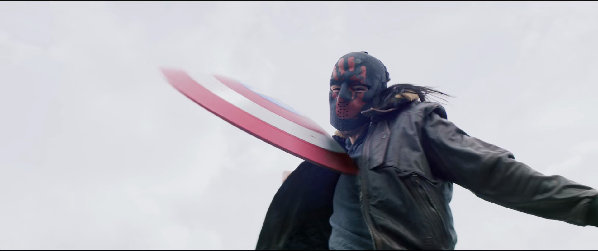 After Walker beat down Wilson and ripped off his EXO-7 Falcon suit, he prepared to use the shield to kill him, but was stopped by Barnes. Barnes and Wilson then got the upper hand and ripped the shield out of Walker's grasp, breaking his arm in the process. Wilson took hold of the shield and slammed it into Walker's back, effectively knocking him out. After the fight, Barnes picked up the shield and dropped it before Wilson, signaling that it was his. Wilson then picked up the shield and tried to wipe the blood off.