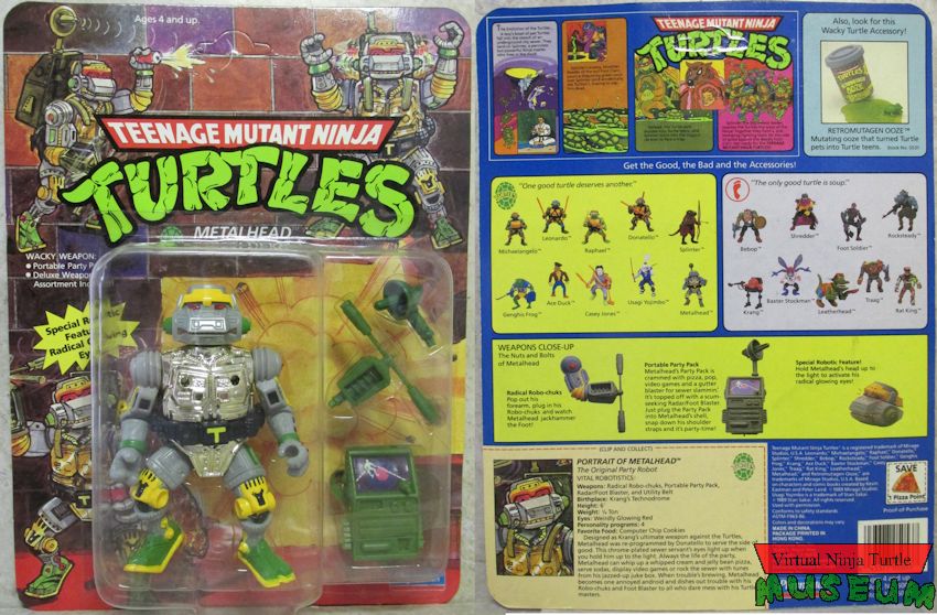 Card Back Text: Designed as Krang’s ultimate weapon against the Turtles, Metalhead was re-programmed by Donatello to serve the side of good. This chrome-plated sewer servant’s eyes light up when you hold him up to the light. Always the life of the party, Metalhead can whip up a whipped cream and jelly bean pizza, serve sodas, display video games or rock the sewers with tunes from his jazzed-up juke box. When trouble’s brewing, Metalhead becomes one annoyed android and dishes out trouble with his Robo-chuks and Foot Blaster to all who dare mess with his Turtle masters.