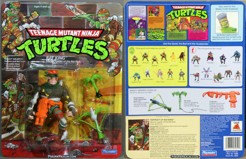Card Back Text: No one knows for certain where he came from, but one thing is for sure. Rat King revels in scum and scum revels in him. The creepiest of sewer crawlies nest in his royally rotten rags. The self-proclaimed King of the Ratocracy, he hypnotizes his rodent subjects with his seductive flute playing. Even Splinter succumbs to his magical musical powers. Rat King’s army protects his slimy kingdom by fighting tooth and whisker against all outsiders, good or bad. Watch out! Rat on his loyal subjects and you may be wrestling with his Rat Hook or running for your life from Rat King’s Royal Ratbow. Rat King’s motto is: “First the sewers, then the world !” He and Shredder are battling for total sewer domination while the Turtles are defending their “Home Sweet Sewer” from both. Looks like plenty of trouble underfoot!
