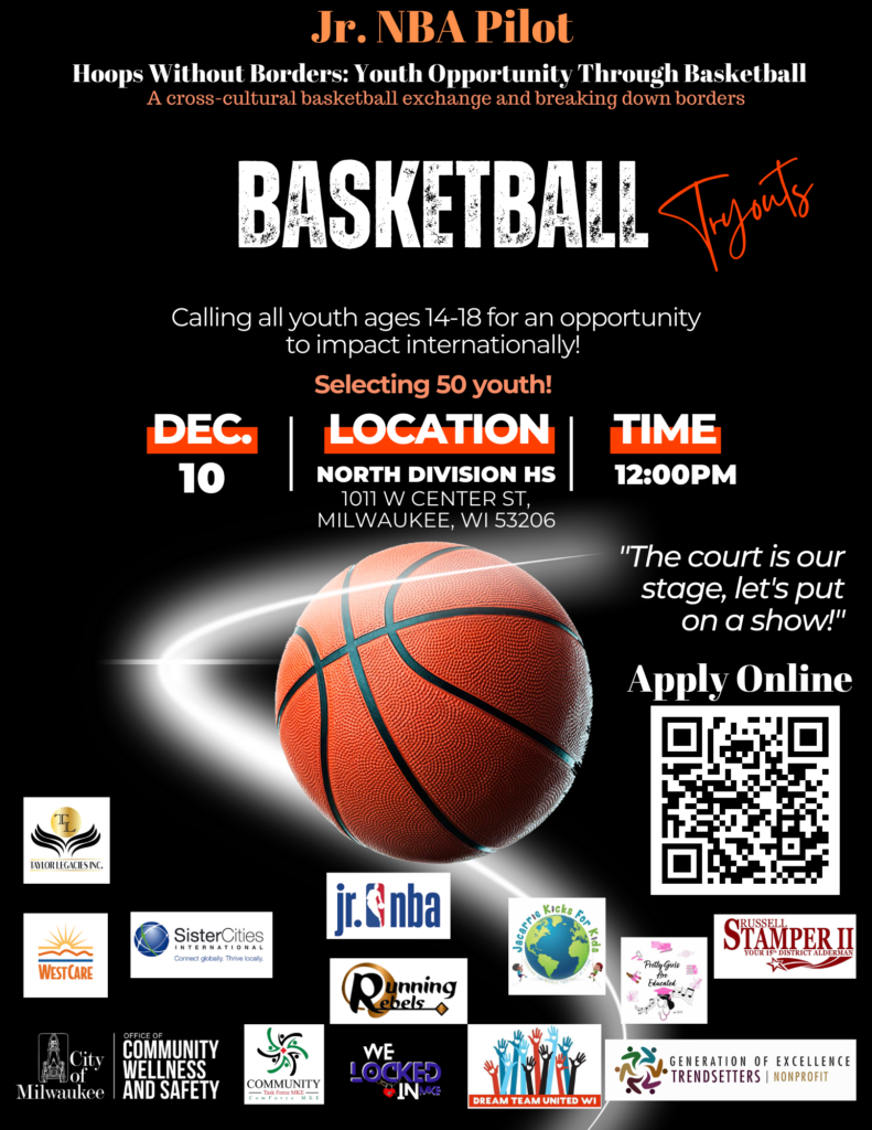 The Jr. NBA Hoops Without Borders: Youth Opportunity Through Basketball program will hold tryouts for 14-18 year olds at noon on Sunday, December 10 at North Division High School, 1011 W. Center St.