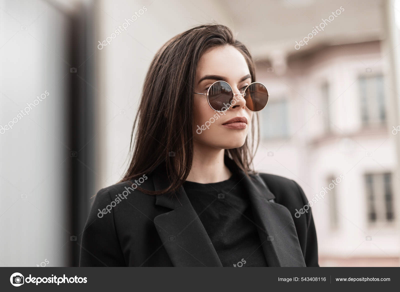 Retrato elegante boa jovem mulher encantadora com cabelo castanho com lábios sexy com pele limpa bonita em óculos de sol frescos na moda em preto blazer na moda perto da parede do vintage na rua na cidade. Moda. — stock imagem, fotos sem royalties