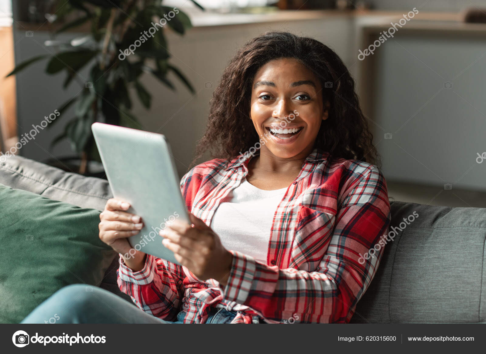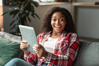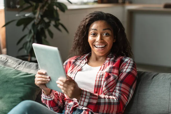Ainda bem que a jovem mulher bonita preto lendo boa mensagem no tablet, assistindo vídeo chocante, desfrutar de venda no interior da sala de estar. Grande oferta e anúncio, novo aplicativo, emoções em casa durante o covid-19 — stock imagem, fotos sem royalties
