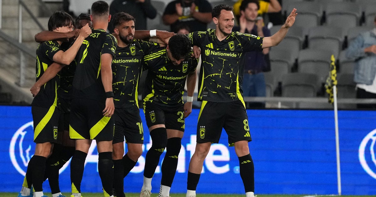 Dániel Gazdag and Diego Rossi each scored to help the Columbus Crew beat the LA Galaxy 2-1 in a game delayed for over two hours due to weather.