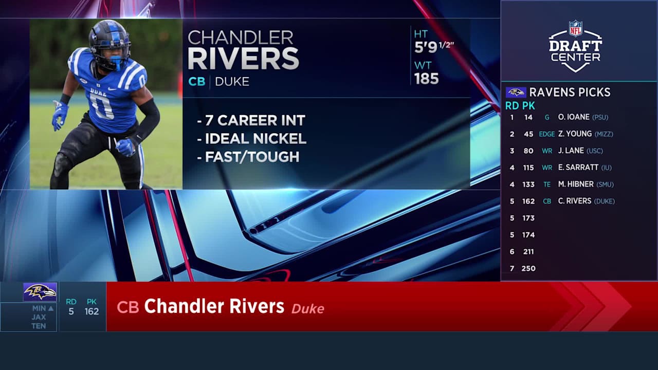 The Baltimore Ravens select Duke Blue Devils cornerback Chandler Rivers in Round 5 of the 2026 NFL Draft with the No. 162 overall pick (via a trade wi