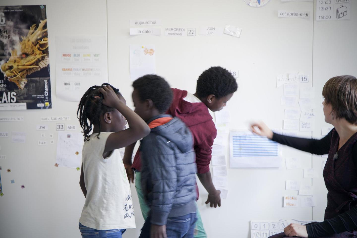 Une classe, inaugurée il y a cinq semaines derrière les grilles du centre d’accueil Jules-Ferry jouxtant la « jungle » de Calais, accueille des réfugi