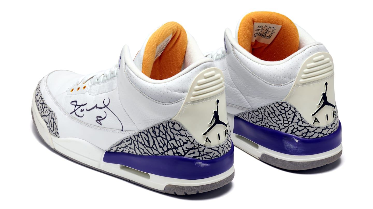 Los Angeles Lakers legend Kobe Bryant's player-exclusive Air Jordan 3 basketball shoes from February 2003 are available at auction.