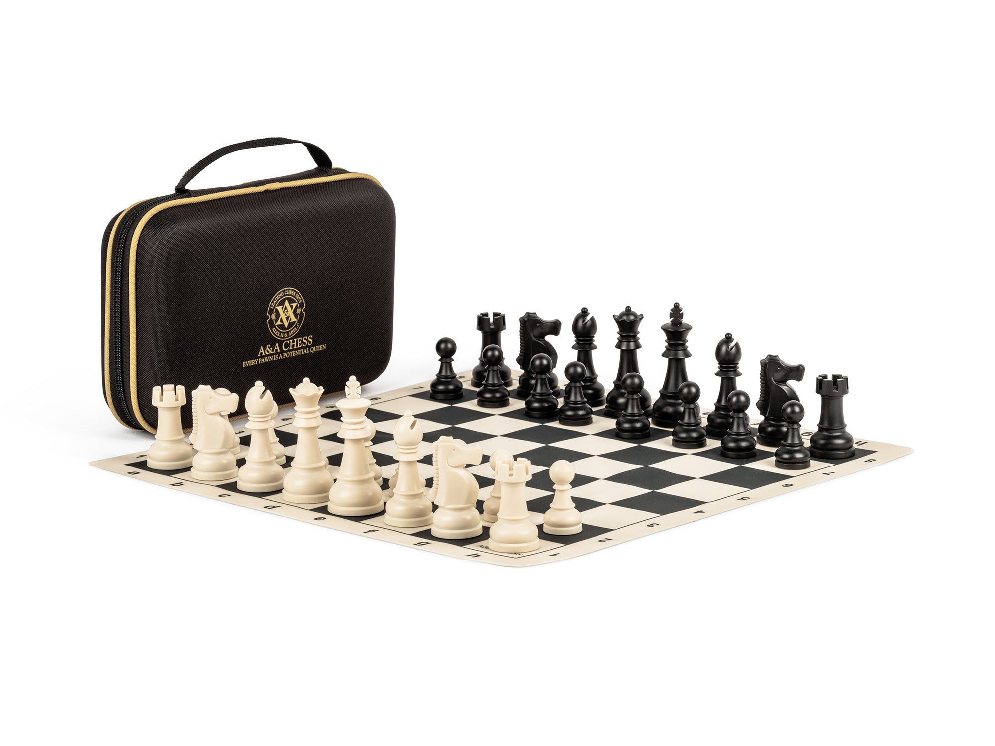 Dieses Roll-up-Schachset verfügt über ein 15" Silikonbrett, Staunton-Figuren, einen 3,25" König, eine Reisetasche und ein Regelhandbuch – langlebig, t