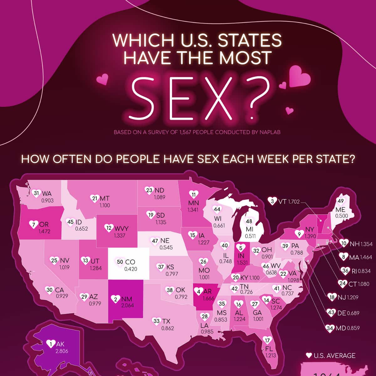 We surveyed 1,567 adults in the US to determine which US states are having the most sex! Is your state on top? Find out now!