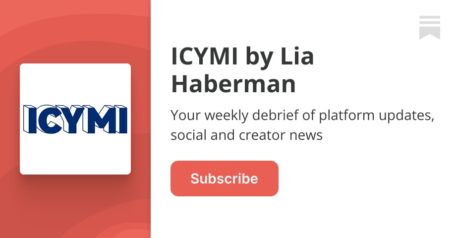 Your weekly debrief of platform updates, social and creator news. Click to read ICYMI by Lia Haberman, a Substack publication with tens of thousands o