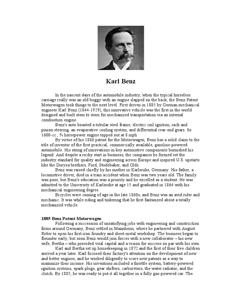 Karl Benz was a German mechanical engineer who invented the first practical automobile, the Benz Patent Motorwagen, in 1885. The Motorwagen had an internal combustion engine, steel frame, differential gears, and could travel up to 8 mph. Benz's wife Bertha helped popularize the automobile by taking the first long-distance trip in one in 1888. Benz went on to found early automobile companies that helped establish quality standards in Europe and inspired carmakers around the world. He received many patents for automotive innovations and merged his company with Daimler in 1926 to form Daimler-Benz, now Mercedes-Benz.