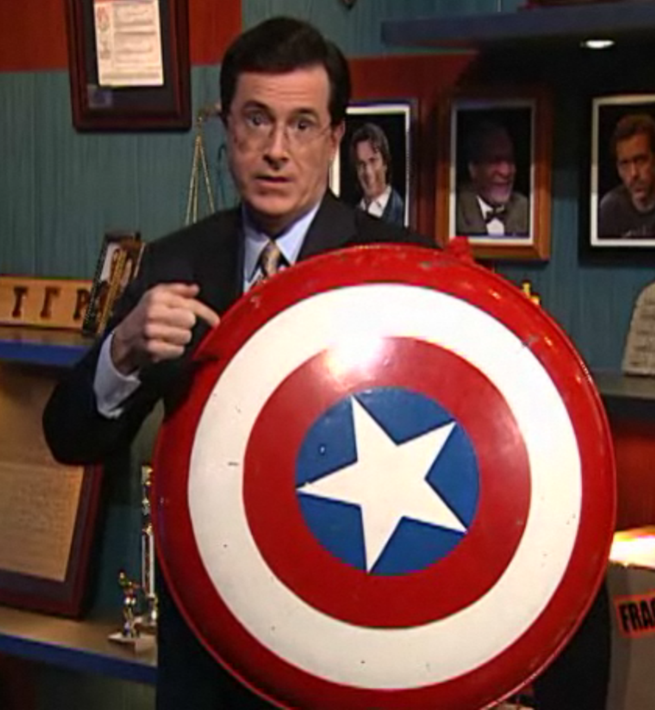 - On the late night television show The Colbert Report, Stephen Colbert had Captain America's shield hanging on the wall of the set. It is now featured on the set of his show The Late Show with Stephen Colbert.