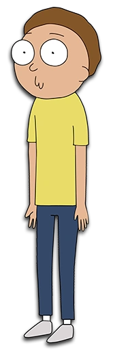 - Morty is a young teenage boy. He has short brown hair that he wears straight and neatly combed around his head. Morty's head is round and roughly in the shape and size of a circle, unlike many other characters in the show. He wears a yellow shirt, blue pants, and white shoes. He has a pronounced stutter (even when calm) and his voice constantly breaks due his effects of puberty. Notably, Morty doesn't have a visible neck.