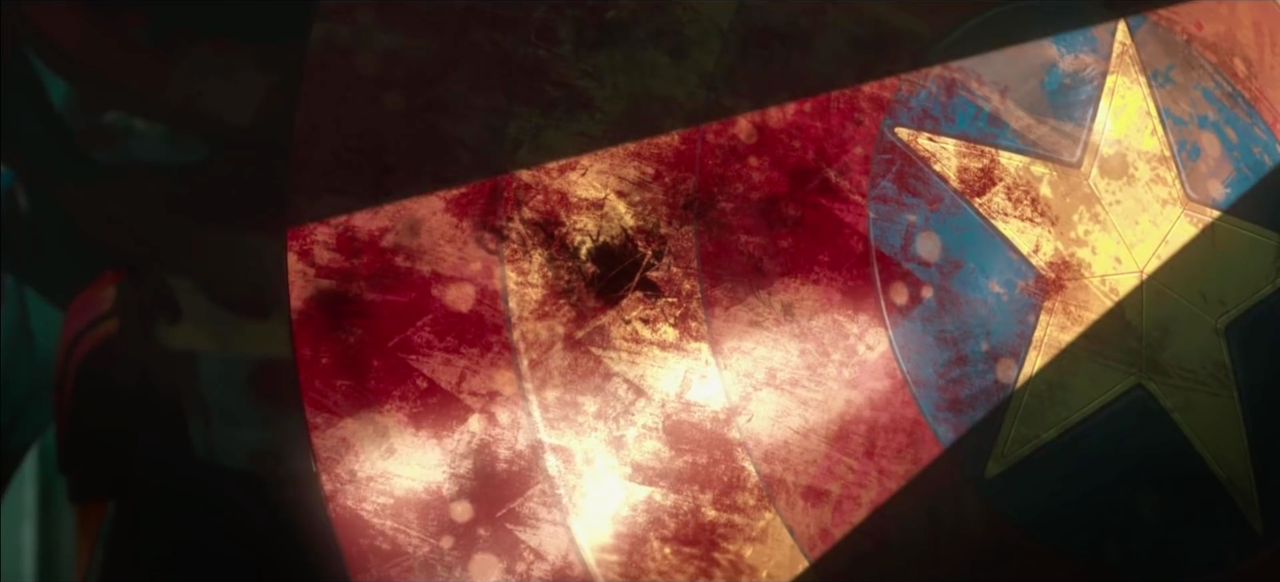 After Walker beat down Wilson and ripped off his EXO-7 Falcon suit, he prepared to use the shield to kill him, but was stopped by Barnes. Barnes and Wilson then got the upper hand and ripped the shield out of Walker's grasp, breaking his arm in the process. Wilson took hold of the shield and slammed it into Walker's back, effectively knocking him out. After the fight, Barnes picked up the shield and dropped it before Wilson, signaling that it was his. Wilson then picked up the shield and tried to wipe the blood off.