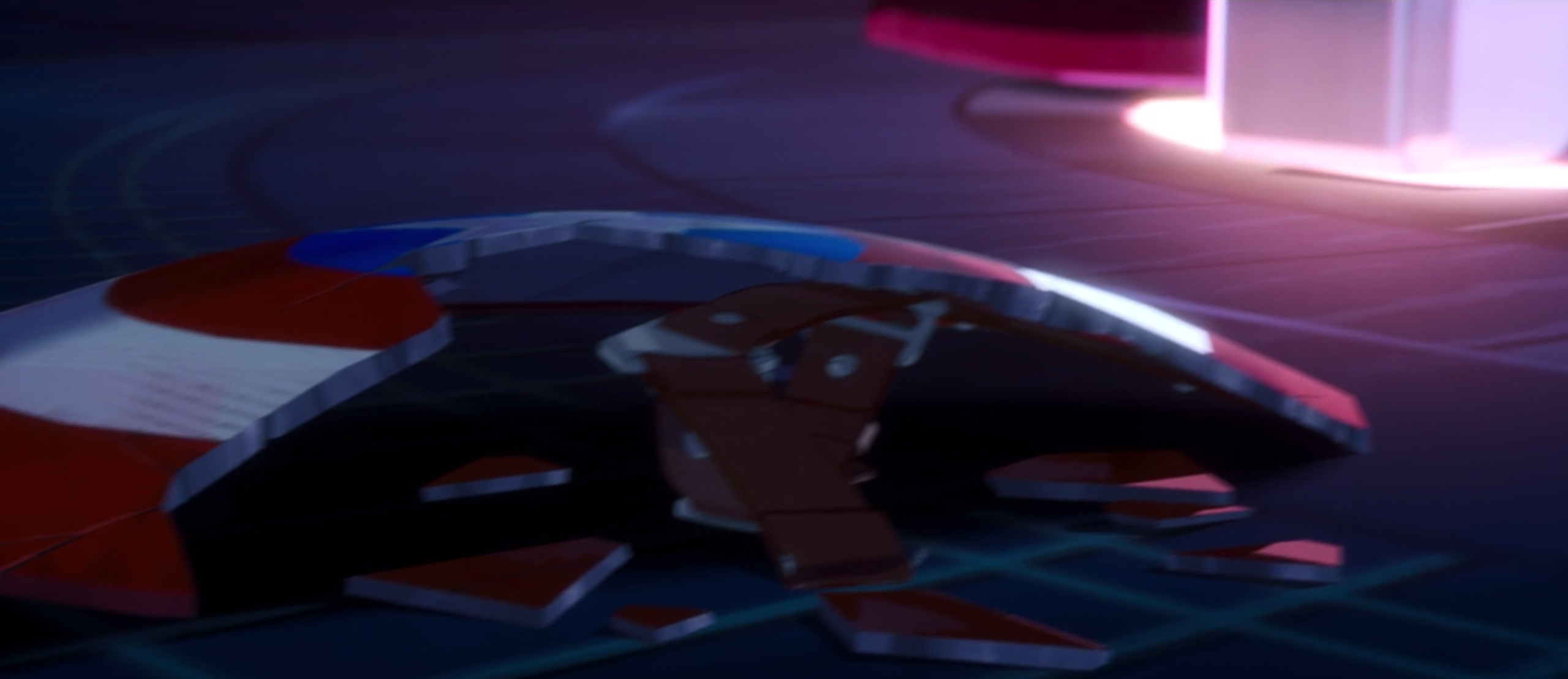 After the attack on the Avengers Compound, Iron Man recovered the shield in the ruins and returned it to Captain America. During the final confrontation with an alternate Thanos, Captain America wielded the shield along with Mjølnir. Unfortunately, the shield was broken by Thanos' brute force with his Double-Edged Sword, leaving Captain America with a fractured shield. Even so, Captain America stubbornly fastened the strap on his shield and continued to use it in the Battle of Earth. After the battle, Captain America had no more use of the damaged shield.[3]
