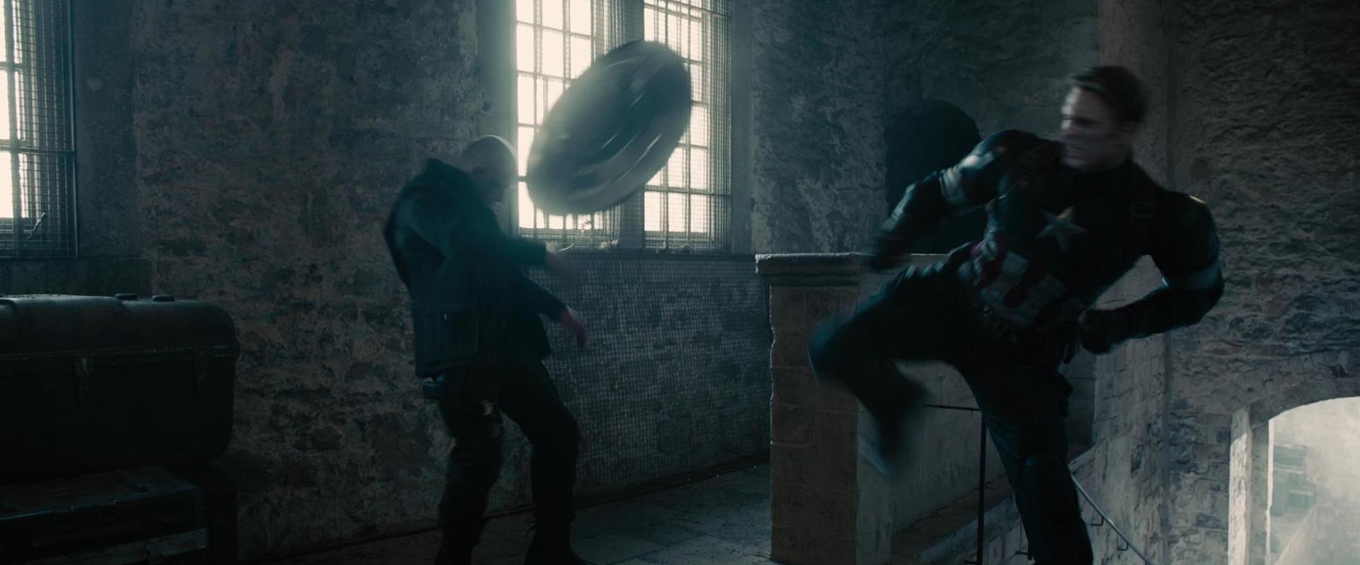With Captain America captured, his shield was taken by a HYDRA soldier, while he was interrogated by Red Skull. However, before Red Skull could execute him, Captain America was saved by the Howling Commandos and the United States Armed Forces, who stormed the base, with James Montgomery Falsworth throwing Captain America his shield during the chaos. Captain America chased Red Skull and threw his shield, only for it to become jammed in a doorway.