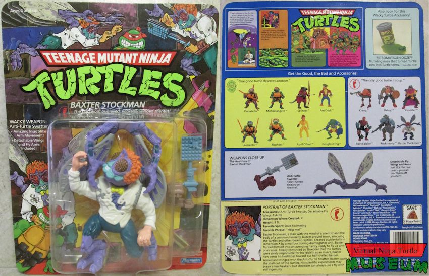 Card Back Text: Baxter Stockman, a man with the mind of a scientist and the body of a common housefly, buzzes around town, annoying the Turtles and other decent reptiles. Created accidentally in Dimension X by a malfunctioning disintegrator unit, Baxter flurried himself into an avenging frenzy, ready to fly up anyone’s nose. Finally convinced by Shredder that the Turtles were solely responsible for his rebirth as an insect, Baxter now vents his hostilities toward our half-shelled heroes. Armed and winged with the Anti-Turtle Swatter, Baxter swats the shell out of the Turtles. His scientific experiments may break a few beakers, but Shredder can always use a fly with evil ingenuity.