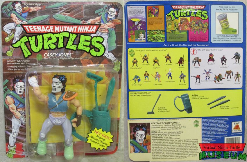 Card Back Text: Like all psychos, Casey Jones, the masked sportsman, wanted to be a legend. Armed with broken bats, shattered dreams, and one golf club, Casey turned his ambition toward crime-fighting. Modeling himself after his favorite vigilante cop show, Casey decided to take the law into his own mitts. Outfitted with castoff sportsgear, Casey challenges every criminal who dares to go out of bounds. This bat-bearing vigilante fights to rid the world of all bad sports, including those who would dare steal second base. Casey’s got a score to settle against all lawless losers – from litterbugs to madmen bent on world domination. Teaming up with our beloved Turtle Teens, Casey strikes out with a special vengeance against Shredder and the Foot Clan!