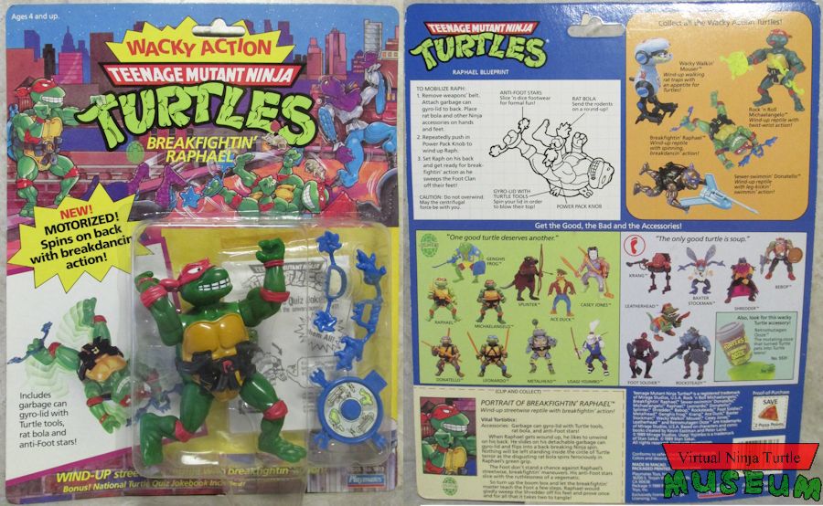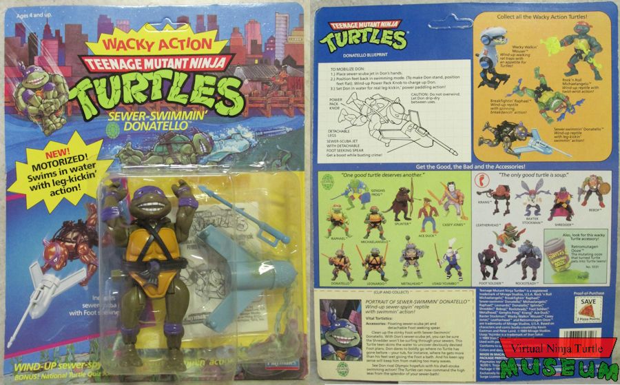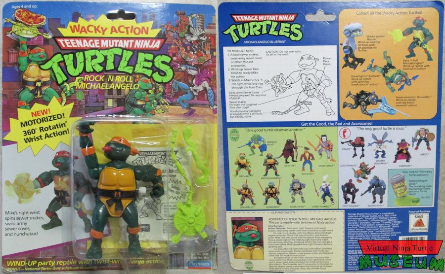 Card Back Text: It’s rock ‘n roll, dudes, with this Wacky Action Michaelangelo wind-up! There’ll be lots of twistin’ and shoutin’ when Mike rolls into battle with his special Ninja weaponry. Stick a sewer snake in his rotating right hand and watch the whizzing, whirling, whipping action! No Foot will get a foot closer while Mike’s powerhouse right forearm delivers gyrating jabs. Cut pizza the old-fashioned way with Mike’s patented swiss-army sewer cover. Comes complete with Turtle can opener, pepperoni cleaver, pizza-power cutter and standard table fork for mock-human action. Bring the thrills of the TMNT cartoon into your own living room! Slip Mike’s nunchukus in his right hand, wind-up his power pack and stand back for three-dimensional articulation! The Shredder won’t know what to do when he sees the deadly sewer snakes spinning furiously at his head (kids, don’t try this at home). Now, the ultimate Ninja warrior’s got a new twist!